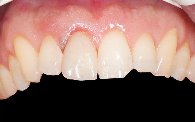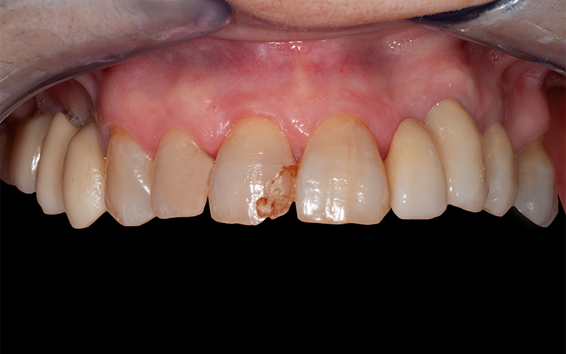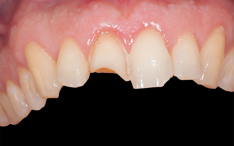 Il paziente si è recato nel nostro studio in seguito ad un trauma sull’incisivo centrale. Dopo aver constatato che la polpa non era interessata dall’evento, e che quindi non andava devitalizzato, si è proceduto con l’applicazione di una faccetta in ceramica. Questa è una soluzione più duratura rispetto ad una ricostruzione in composito. Un buon lavoro protesico infatti, in media, permane in arcata dai nove ai dodici anni.