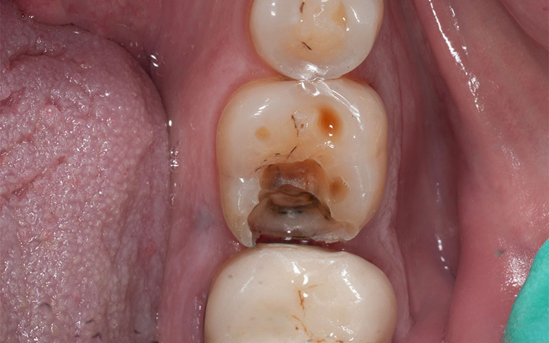 Il paziente si è presentato alla nostra osservazione con un molare inferiore ampiamente cariato. Poiché la carie comprendeva il punto di contatto con il dente vicino, gli è stato proposto un intarsio. Tale manufatto è una soluzione intermedia tra l’otturazione e una classica corona. Si lima e si prepara solo la porzione di dente mancante, si prende l’impronta digitale e il tecnico ricostruisce solamente la porzione di dente mancante.