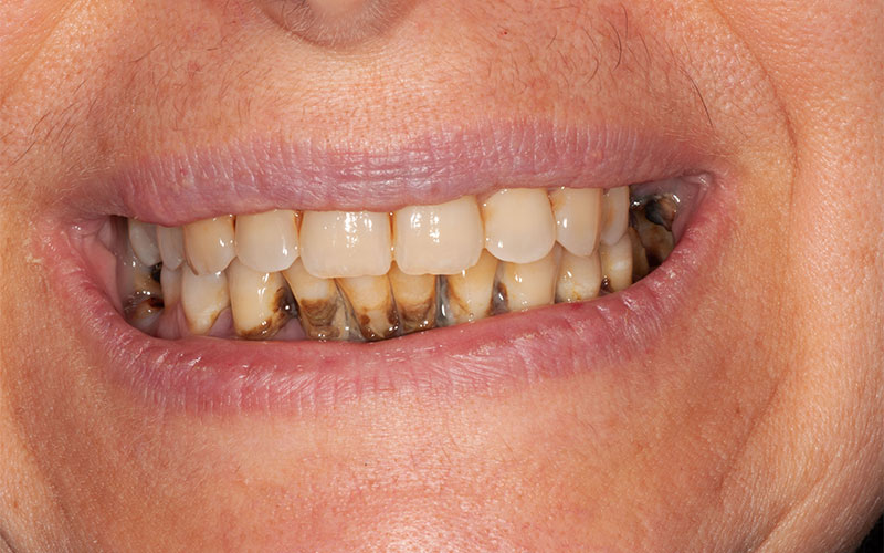 Il paziente aveva quattro carie cervicali (al margine tra gengiva e dente). Le carie in questa sede possono insorgere o per accumulo di placca o, altrimenti, per spazzolamento orizzontale ed eccessivamente frenetico. In questo caso, una volta rimosse le carie, sono state ricostruite con otturazioni estetiche. Si consiglia, una volta fatta un’otturazione di mantenerla sempre sotto controllo e fare una volta l’anno una lucidatura di quest’ultima.